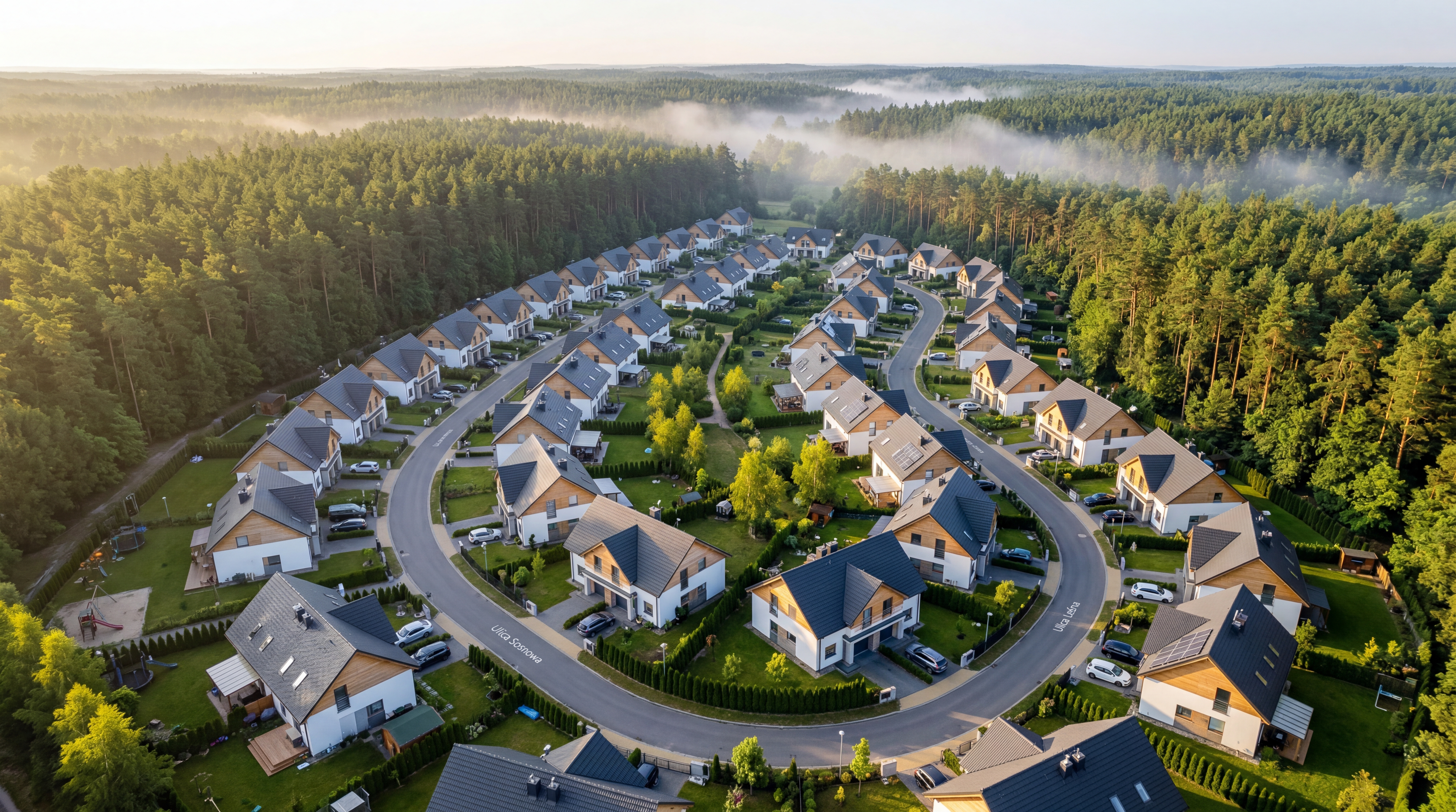Profesjonalny film z drona prezentujący osiedle, okolicę i architekturę domów.
